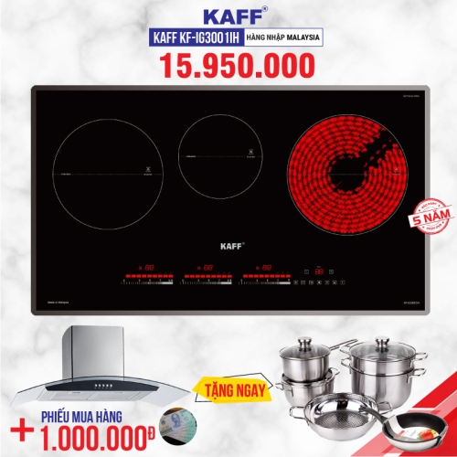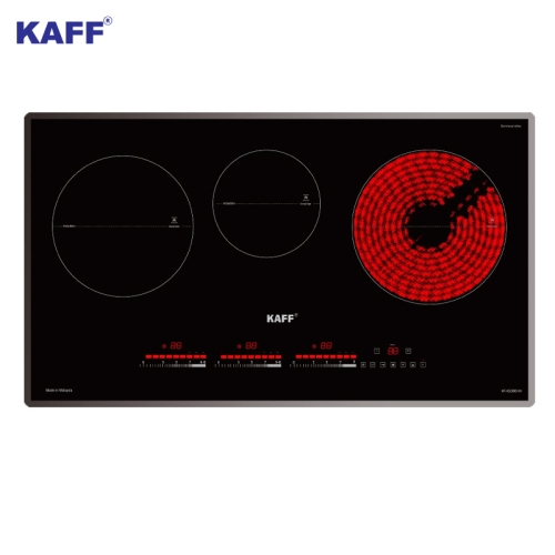 Bếp điện từ 3 lò cảm ứng KAFF KF-IG3001IH, thuộc dòng bếp điện từ cao cấp của thương hiệu thiết bị nhà bếp nổi tiếng tại Đức KAFF, là sự kết hợp hoàn hảo giữa 2 bên bếp từ (sử dụng các bộ nồi chảo inox từ, tiết kiệm điện và đun nấu nhanh hơn) và 1 bên bếp điện hồng ngoại (không kén nồi và có thể nướng trực tiếp trên bề mặt bếp), 3 vùng nấu hỗn hợp (2 từ, 1 điện) phù hợp với gia đình đông thành viên và có không gian nhà bếp rộng, giúp cho cuộc sống của bạn thuận tiện hơn.