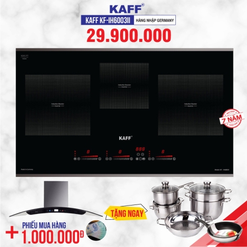 Bếp từ 3 lò cảm ứng KAFF KF-IH6003II, Dòng bếp Nhập khẩu nguyên chiếc từ Đức, thuộc dòng bếp từ cao cấp của thương hiệu thiết bị nhà bếp nổi tiếng tại Đức KAFF, là sự kết hợp hoàn hảo giữa 3 bên bếp từ (sử dụng các bộ nồi chảo inox từ, tiết kiệm điện và đun nấu nhanh hơn). Đặc điểm bếp từ là làm nóng nhanh, hiệu suất nấu nướng cao nên rất phù hợp với những món ninh, hầm, luộc, ... Đặc biệt, lò nấu bếp từ còn có thể phát tín hiệu thông báo khi chất liệu xoong nồi không phù hợp với lò nấu từ.