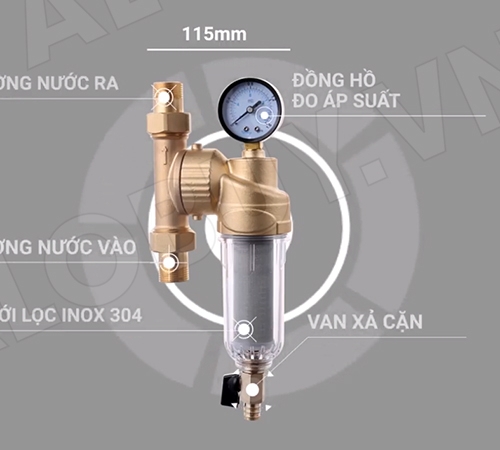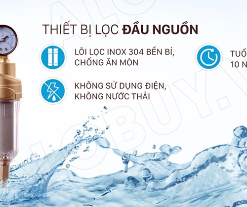- Thiết bị lọc đầu nguồn có lõi lọc inox với thiết kế các mắt lưới nhỏ dưới 60 micromet đảm bảo nguồn nước vệ sinh hơn, dùng cho các hoạt động sinh hoạt của cả gia đình như tắm rửa, giặt giũ, rửa rau, vo gạo…, ngăn ngừa các bệnh viêm da, xơ tóc, các bệnh liên quan đến tiêu hóa.
