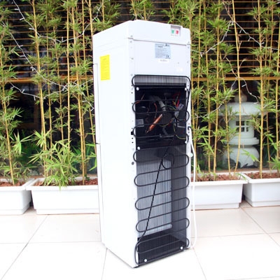 - Làm lạnh tốt: Máy nén (Block) nén môi chất lạnh sẽ làm tăng áp suất và nhiệt độ của môi chất lạnh. Dàn ngưng (dàn nóng) phía sau cây nước nóng lạnh cho phép môi chất lạnh có thể giảm bớt nhiệt do áp suất gây ra. Môi chất lạnh chuyển từ khu vực có áp suất cao sang khu vực có áp suất thấp. Và tại đây diễn ra quá trình bay hơi và trong khi bay hơi môi chất lạnh sẽ hấp thụ nhiệt từ môi trường xung quanh, và khi đó quá trình này cũng sẽ lập đi lập lại.