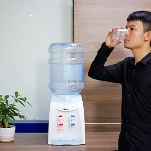 Đặt bình nước lên Cây nước và bật 2 công tác lạnh/nóng phía sau máy