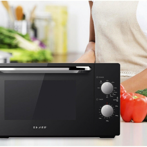 Nút diểu khiển cơ học hiện đại Có hiển thị hướng dẫn bằng tiếng Việt, Sản phẩm được thiết kế đơn giản, dễ sử dụng, Cửa lò vi sóng Sharp mẫu này có thiết kế tay cầm để mở dễ thao tác đơn giản, tinh tế