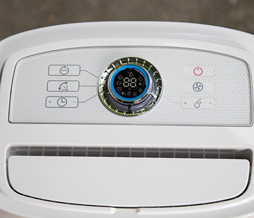 Trên bảng điều khiển, ở bên tay phải trên cùng là nút tắt/mở máy, ngay phía dưới là chức năng quạt gió, tiếp theo là chế độ hút ẩm (hình giọt nước) sẽ làm khô nhanh sàn nhà khi thời tiết nồm ẩm, có thể điều chỉnh chế độ hút ẩm tăng giảm theo các nút cộng trừ 5%, dải độ ẩm hoạt động của máy là từ 30 đến 80%.