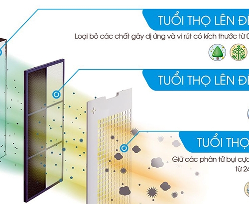 3 lớp màng lọc: màng lọc sơ cấp,, than hoạt tính, màng lọc kháng khuẩn và HEPA+ |