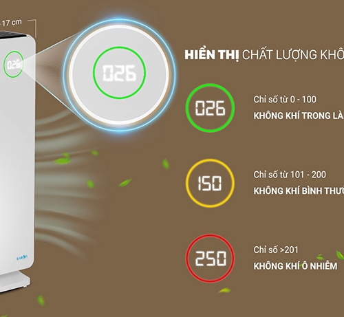 + Hiển thị chất lượng không khí: Máy sẽ chủ động cảnh báo chất lượng không khí của căn phòng bằng các biểu tượng màu sắc trên màn hình led như: màu xanh thể hiện không khí trong lành, màu vàng – không khí bình thường, màu đỏ – không khí ô nhiễm. Với cách thể hiện màu sắc, bạn hay bất kỳ thành viên nào trong gia đình đều dễ dàng nhận biết được chất lượng không khí trong phòng của mình.