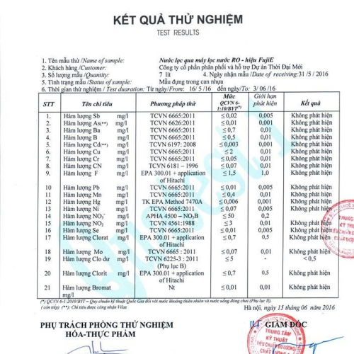 VIỆN PASTEUR TP HCM VÀ TỔNG CỤC TIÊU CHUẨN ĐO LƯỜNG CHẤT LƯỢNG CÔNG BỐ KẾT QUẢ NGUỒN NƯỚC ĐẠT CHUẨN TỪ MÁY LỌC NƯỚC RO FUJIE
