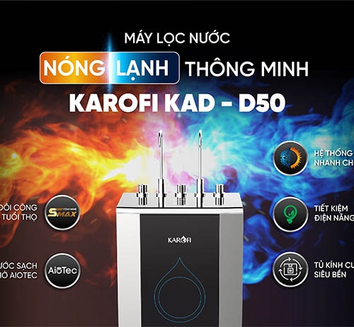 Máy lọc nước RO Nóng Lạnh 2 vòi KAROFI KAD-D50 (10 lõi lọc SMAX - Màng RO 100GPD thay nhanh Mỹ, gấp 1.5 lần tuổi thọ so với màng RO thông thường) của hãng điện gia dụng hàng đầu KAROFI - Chuẩn mực mới nhất của làm nước sạch và an toàn.Các nguồn nước đầu vào có thể nhiễm bẩn nhưng sau khi qua hệ thống lọc nước sẽ đều cho ra nước tinh khiết với tất cả những chất bẩn, chất độc hại bị loại bỏ hoàn toàn, mang lại sự an tâm cao cho người sử dụng.