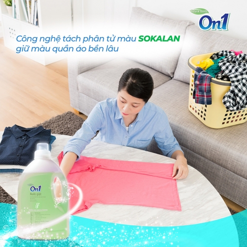 Thử ngay nước giặt On1 2 trong 1 loại bỏ vi khuẩn gây mùi lì lợm ngay trong lần giặt đầu tiên. Không chỉ chứa các hoạt chất kháng khuẩn tiêu diệt tận gốc vi khuẩn, ngăn ngừa mùi hôi phát sinh trên sợi vải, nước giặt On1 còn Sở hữu công nghệ tách phân tử màu SOKALAN Để giữ màu tối ưu cho quần áo , hãy chọn dùng nước giặt xả ON1 2 trong 1 chuyên dụng cho quần áo màu, loại nước giặt này sẽ giúp loại bỏ vết bẩn dễ dàng mà không làm phai màu quần áo của bạn.