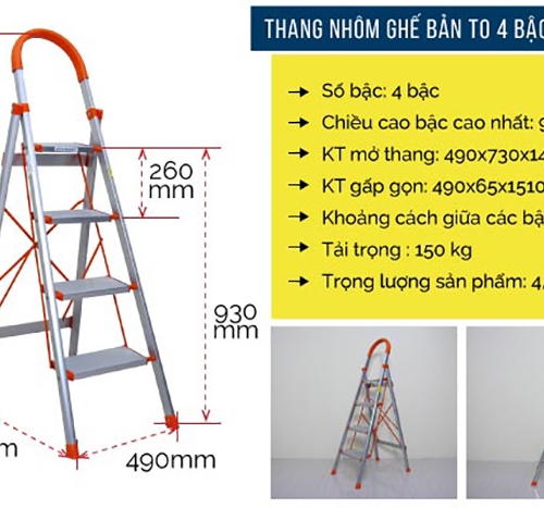 - Kích thước khi mở thang : 490(ngang bậc) x 730(dài) x 1415(cao) mm