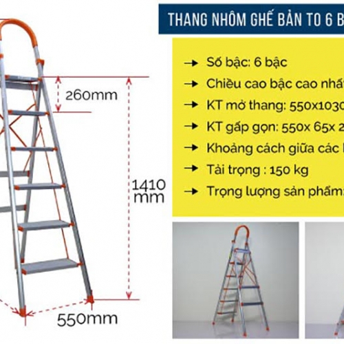 THÔNG SỐ KỸ THUẬT CỦA THANG NHÔM GHẾ 6 BẬC BẢN TO XẾP GỌN ADVINDEQ ADS706