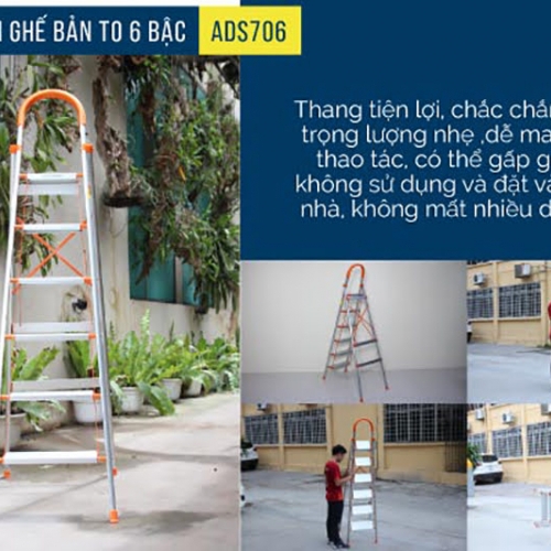 Thang nhôm ghế 6 bậc xếp gọn bản to Advindeq ADS706 Thang thiết kế bản to rất vững vàng, ít bị rung lắc