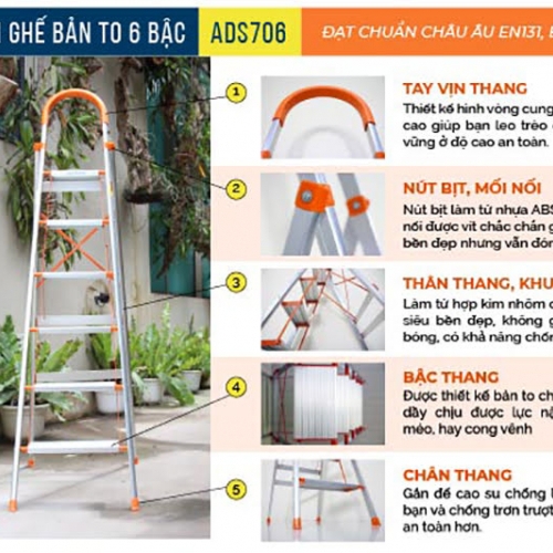 Thang nhôm ghế 6 bậc xếp gọn bản to Advindeq ADS706 được thiết kế theo tiêu chuẩn châu Âu EN131, EN14183, CE, công nghệ Đài Loan, chính hãng. Với tiêu chuẩn này càng tăng thêm tính an toàn cho người sử dụng tin dùng.