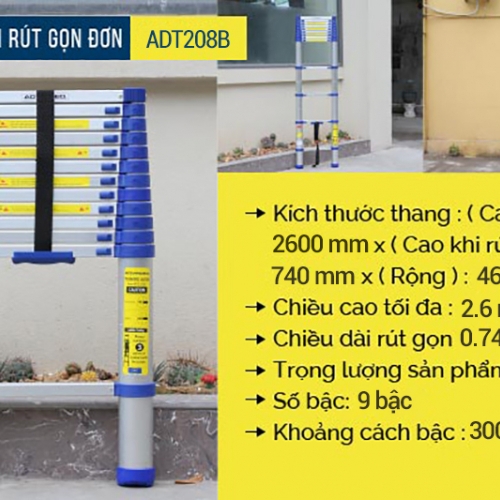 Thang nhôm đơn rút gọn Advindeq ADT208B có chiều cao tối đa 2,6m, rút gọn 0,74m