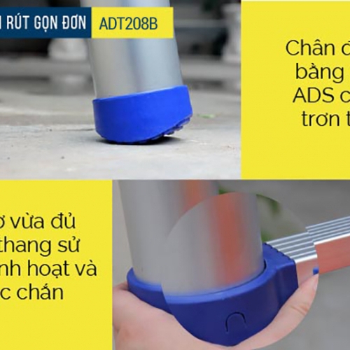 Chân đế được bao bọc bởi một lớp cao su bền chắc chống trơn trượt, dưới chân đế được thiết kế theo kiểu răng cưa ma sát tốt, không bị trầy xước nền nhà, mặt kính lúc thang tựa vào. Thang nhôm đơn rút gọn Advindeq ADT208B thuộc dòng thang rút nên rất phù hợp với nhân viên lắp đặt thiết bị viễn thông, các công trình xây dựng, thợ sửa chữa, truyền hình cáp, trang trí nội thất dùng trong nhà và ngoài trời… Ngoài ra thang cũng có thể dùng cho gia đình sửa chữa các vật dụng trong nhà trang trí tranh ảnh, quạt trần,… cho ngôi nhà khang trang lộng lẫy hơn.